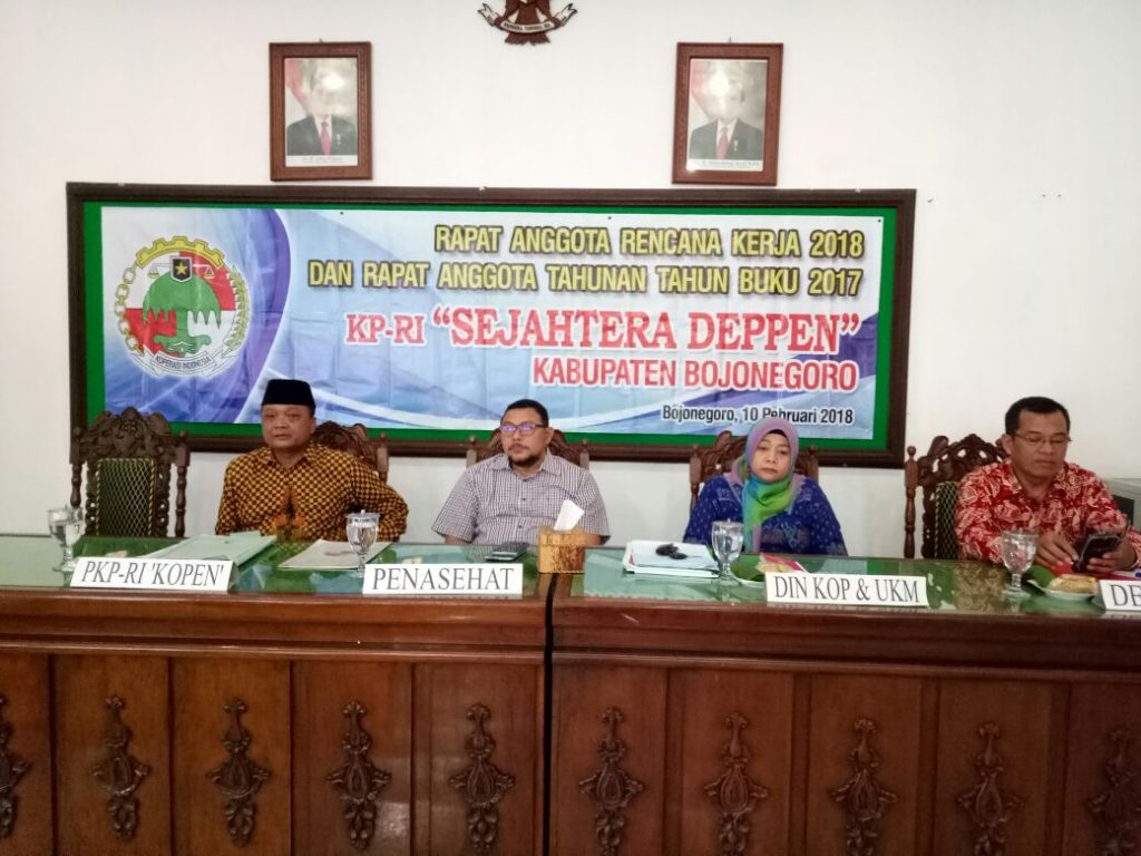 Bojonegoro- Rapat Anggota Tahunan (RAT) KP-RI Sejahtera Deppen Tahun Buku 2017 pilih kepengurusan Baru Masa Bhakti 2018-2020. Sabtu, (10/2/18). RAT yang dilakasanakan digedung PKK Kabupaten Bojonegoro tersebut dihadiri oleh Kepala dinas koperasi dan UM Elzadheba Agustina, Moh. Sholeh selaku pimpinan Dekopinda, Wakhid Priono Perwakilan dari PK-PRI KOPEN dan seluruh anggota koperasi.